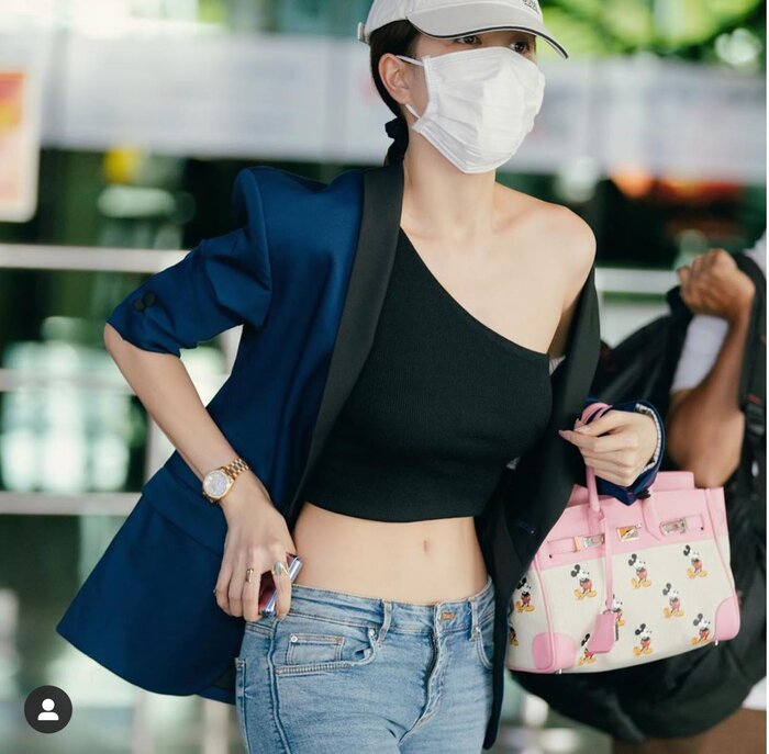 | Style phi trường của nữ hoàng nội y Việt Nam còn đi kèm với kiểu túi Mickey Mouse nhí nhảnh, đáng yêu. |